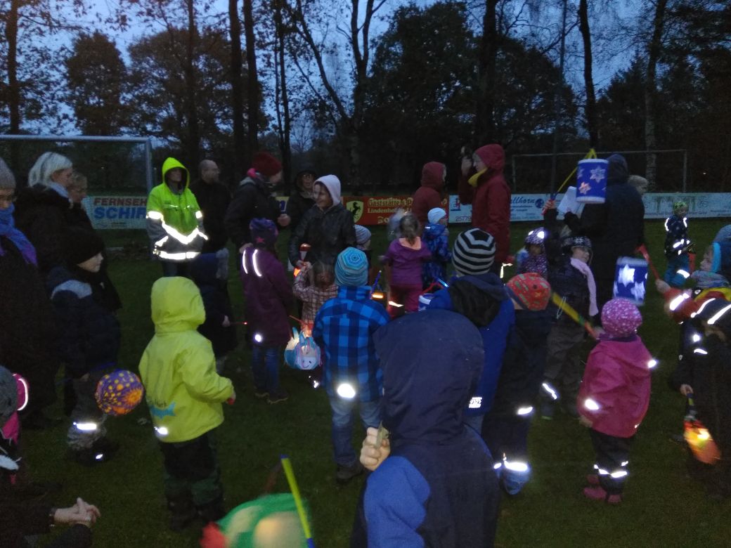 Laternenlüchten im KinnergoornIm November fand unser diesjähriges Laternenlüchten wieder „live und in Farbe“ auf dem Außengelände des Kindergartens statt. Zum Auftakt wurde das Lied „Min Laterne lüchtet dört Land“ angestimmt. Alle Kinder sangen fröhlich mit und hielten stolz ihre selbstgebastelten Laternen in den Händen. Danach ging es von Lichtstation zu Lichtstation, wo mit Gitarrenbegleitung das gesamte Laternenliederrepertoire gesungen wurde. Im lichtergeschmückten Außenbereich der Krippengruppe angekommen, konnten sich alle an Gemüsesuppe, Kürbiskeksen und heißem Apfelsaft stärken. Bei leiser Hintergrundmusik klang der Abend mit lockeren Gesprächen gemütlich aus. Alle freuen sich schon auf das Laternenlüchten im nächsten Jahr. |