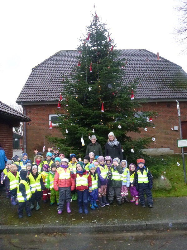 Tannenbaum schmücken im DorfZur Freude der Gemeindevertreterinnen Angelika Herrmann und Dörte Junge-Urbahns trotzten die Kinder des Kinnergoorn Küselwind dem Wetter und wanderten zum Feuerwehrgerätehaus um den dort aufgestellten Tannenbaum mit selbst gebasteltem Weihnachtsschmuck zu behängen. Alle drei Gruppen hatten Spaß daran, einen gemeinsamen Spaziergang zu machen. Als alle wieder in den warmen Gruppenräumen saßen, gab es für jeden noch einen kleinen Schoki-Weihnachtsmann und der Regen war schnell vergessen. |