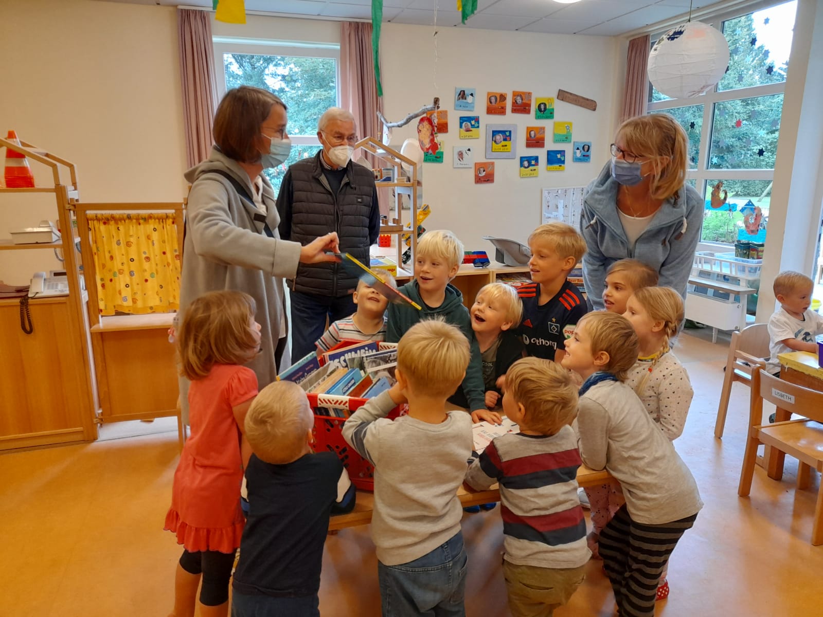 Eine Buchspende für den KindergartenWilli Köster und seine Tochter Imke statteten den Kindern des Kinnergoorn Küselwind einen Besuch ab. Ganz im Sinne seiner vor kurzem verstorbenen Frau Telse, die schon immer ein sehr großes Herz für Kinder hatte, überbrachten die beiden eine Kiste mit vielen großartigen liebevoll ausgesuchten Kinderbüchern. Dieses Geschenk ließ die Kinderaugen erstrahlen. Nach einer kleinen Einführung wurden die Bücher sofort in Beschlag genommen, und die Kinder verzogen sich in die Kuschelecke um ungestört zu stöbern. Alle Kinder und Erwachsenen sagen DANKE DANKE DANKE! September 2021 |