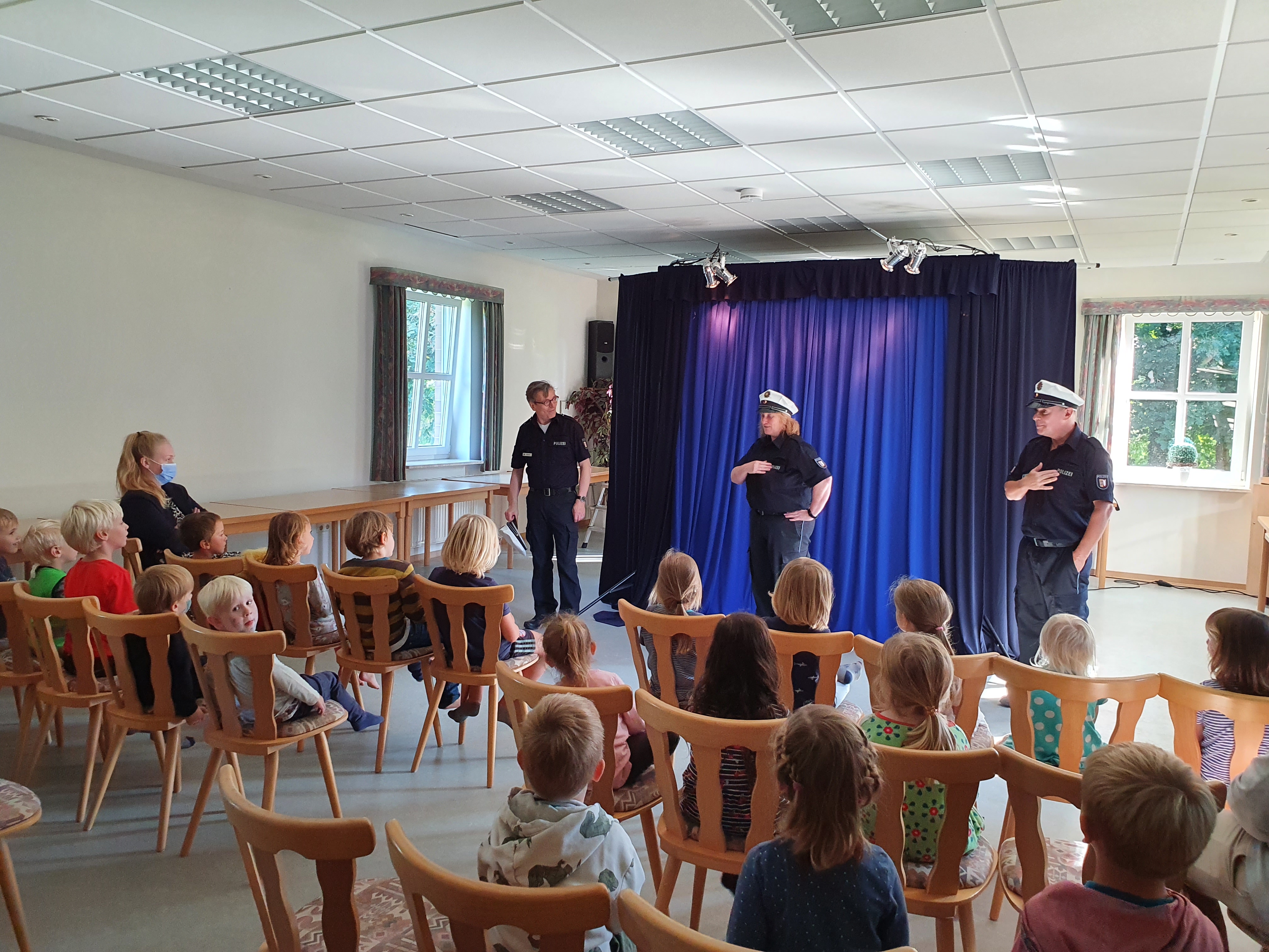 Die Polizeibühne FlensburgDie drei Akteure der Polizeibühne hatten die Kantsteinhelden, das Mädchen Pauli, den Hasen Pit und die Möwe Pius, im Gepäck. Mit Gesang und Reimen vermittelten sie den Kindern, wie man die Straße sicher überquert, auch wenn unvorhersehbare Ereignisse eintreten. Der erhobene Zeigefinger, der Verbote untermauert, ist aus dem Programm verschwunden, und die Kinder konnten das zu Lernende spielerisch erleben. Und sogar die Kleinsten waren begeistert. Der diensthabende Polizist der Polizeistation Hennstedt hatte sein Dienstfahrzeug mitgebracht. Wer Lust hatte, durfte das Martinshorn oder das Blaulicht einschalten. Es war ein spannender Vormittag, der allen sehr viel Vergnügen bereitete. September 2021 |