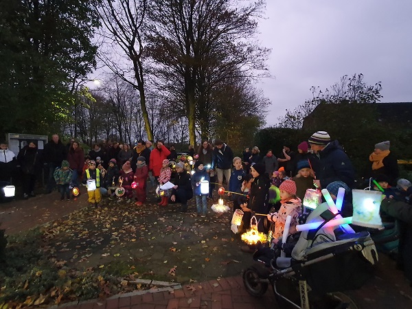 Laternenfest 2022Pünktlich um 17.00 Uhr am 09.11.2022 startete im Kinnergoorn Küselwind das diesjährige Laternenfest. Viele Kinder waren mit ihren selbstgebastelten Laternen ganz aufgeregt am Start. Beim ersten Lied „Min Laterne lüchtet dör ?t Land“ fing es an zu regnen und hörte auch während des gesamten Festes nicht auf. Die Kinder ließen sich den Spaß dennoch nicht verderben und sangen unter dem Fahrradunterstand fröhlich alle eingeübten Laternenlieder mit. Im Anschluss ließen sich Eltern und Kinder die Gemüsesuppe und den heißen Apfelsaft schmecken. |