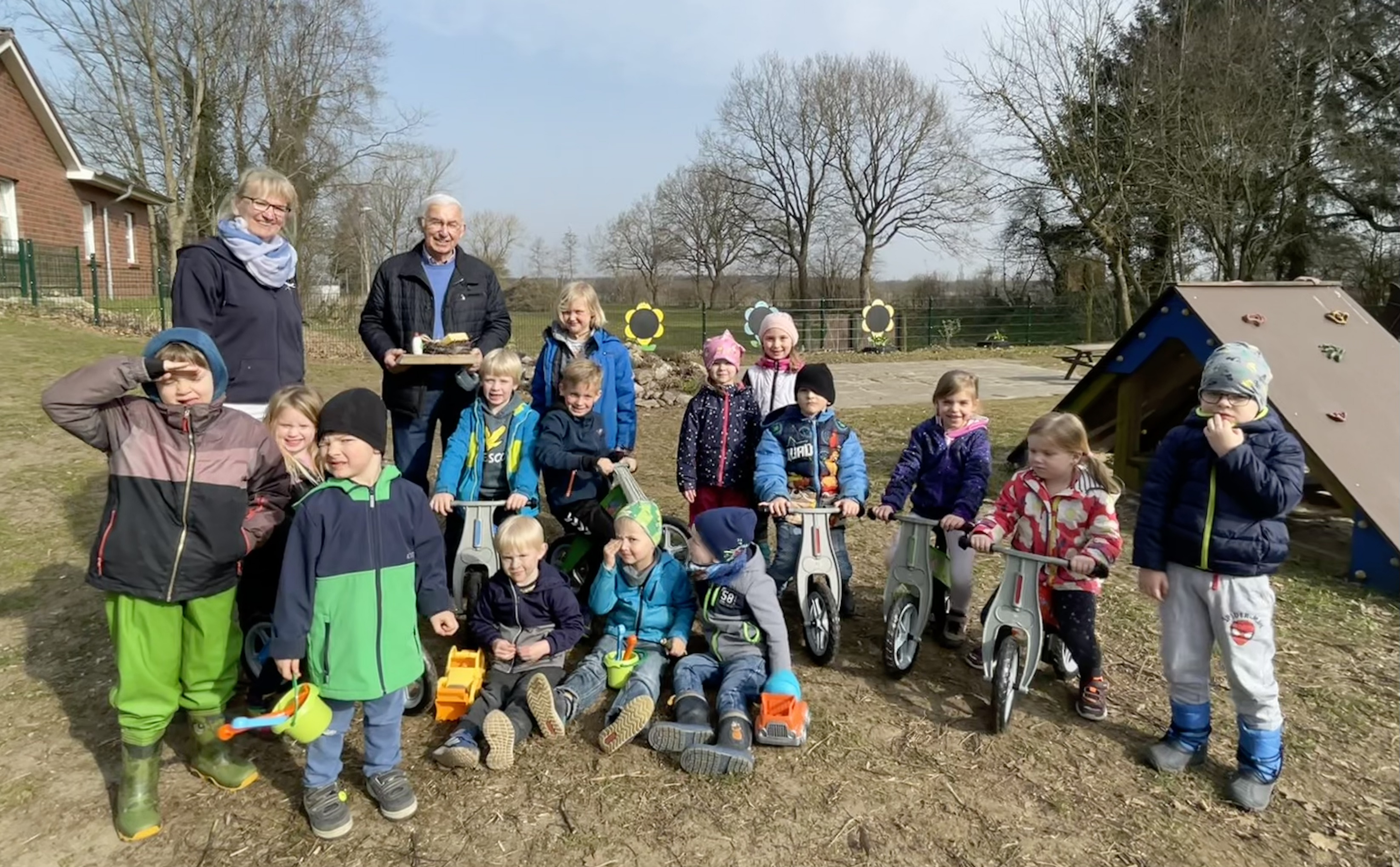 Neue Laufräder und SandspielzeugDer Frühling 2022 ist da, die Sonne lacht, und der Kinnergoorn Küselwind hatte Besuch vom Altbürgermeister Willi Köster. Das Wohl der Kleinsten in unserer Gemeinde liegt der Familie Köster schon seit Jahrzehnten am Herzen. Im Gedenken an Telse Köster bekamen die Kinder neben der großzügigen Bücherspende im September 2021 nun auch noch sechs neue Laufräder und Sandspielzeug von Willi Köster geschenkt. Weil viele der Räder in die Jahre gekommen und nicht mehr reparabel sind, konnte unser Fuhrpark zur Freude aller nun wieder aufgestockt werden. Es gab jeweils zwei Feuerwehr-, Polizei- und Zoo-Räder. Die Übergabe erfolgte mit einer kleinen Ansprache, in der Willi Köster mit einem Augenzwinkern die Nutzung der Laufräder an die Bedingung knüpfte, später in die Freiwillige Feuerwehr der Gemeinde Linden einzutreten. Kein Laufrad blieb lange ungenutzt, denn die Kinder drehten hellauf begeistert ihre Runden auf unserem großen Außengelände. Vielen vielen Dank für das großartige Geschenk. |