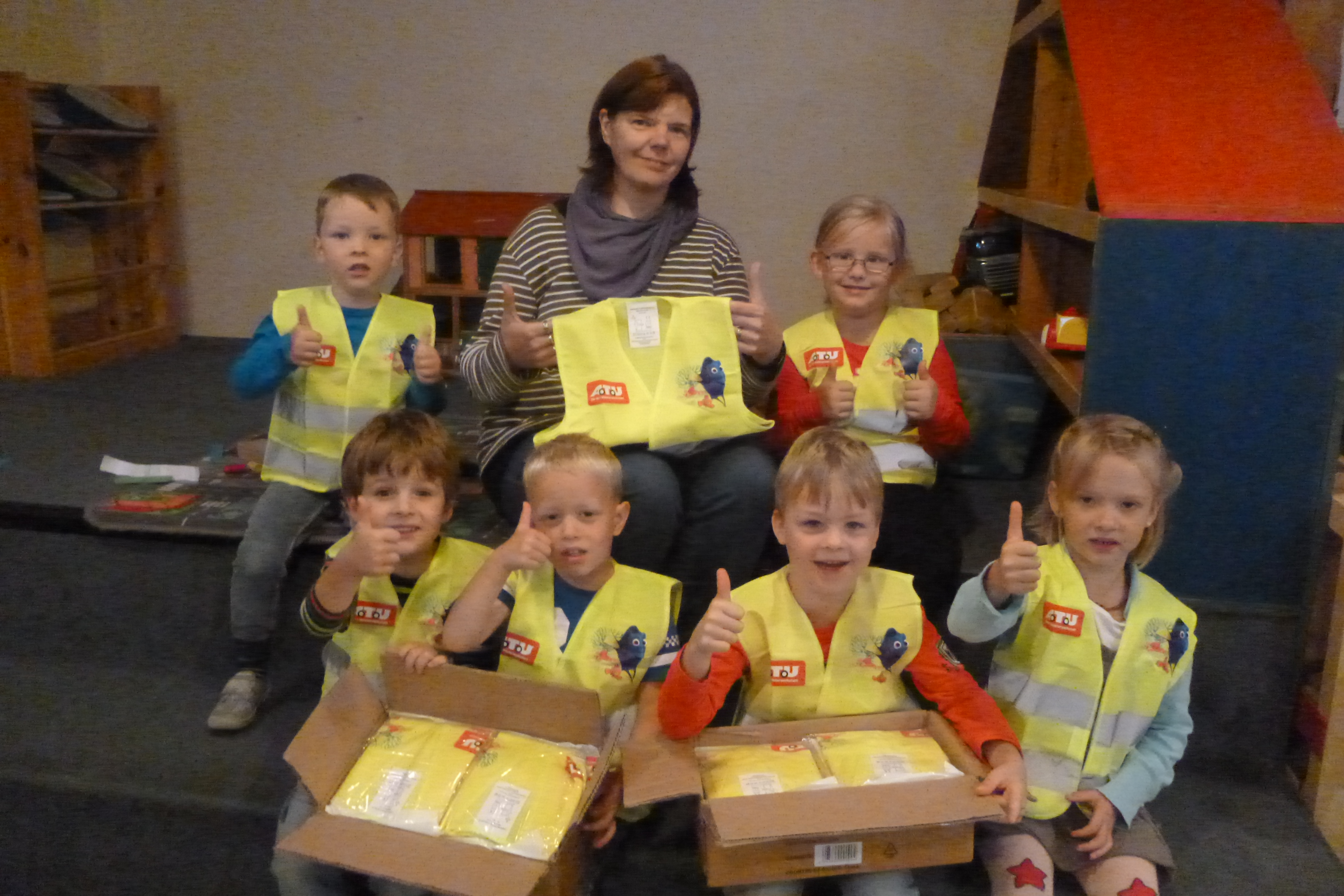Warnwesten für unseren Kinnergoorn KüselwindWir haben von der diesjährigen "Aktion Glühwürmchen" Warnwesten für unseren Kindergarten bekommen. Jetzt sind wir bei unseren Wald- und Wandertagen gut gerüstet. Auch wenn wir zum Einkaufen zu Heikes Hofladen wandern können uns alle Verkehrsteilnehmer gut sehen. Den Kindern gefällt besonders das Motiv mit Dorie und Nemo aus dem Animationsfilm "Findet Dorie". Alle Kinder und Mitarbeiter vom Kinnergoorn Küselwind sagen : DANKE |
